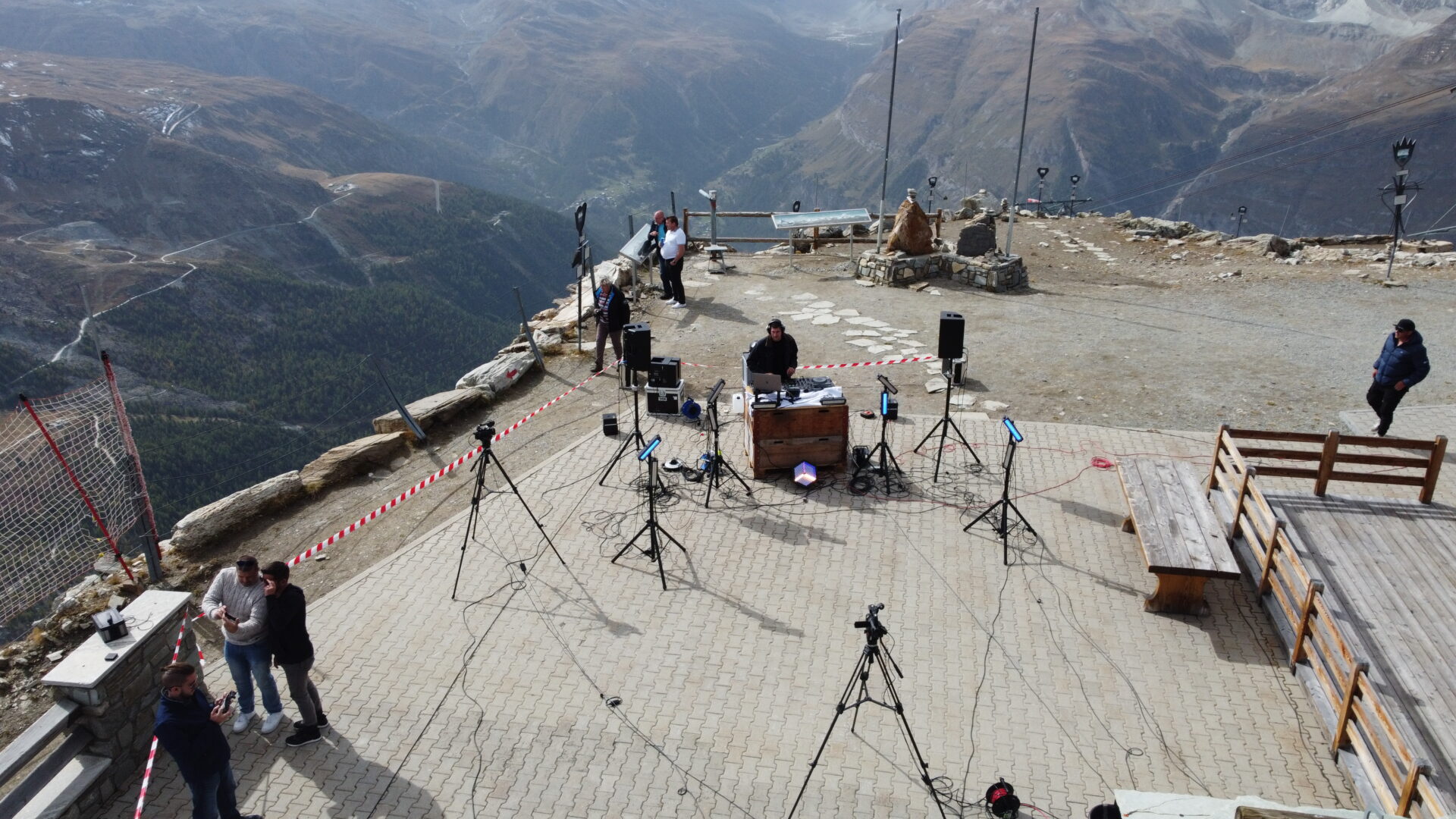Auf der Terrasse des Bergrestaurants Rothorn konnte die Crew erfolgreich das geplante Live-Stream Set-Up inkl. Licht und Ton vor Ort installieren. Da es zu dieser Zeit noch einige Personen vor Ort hatte die am Wandern waren, wurde der Bereich mittels rot-weissem Absperrband gekennzeichnet.